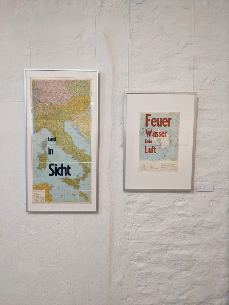 „Walter Schautz Lithographie & Druckwerkstatt im Bernardbau E.A. Epreuve d’Artiste/Künstlerexemplare 2020-23“ ist der Titel einer Ausstellung, die bis zum 12. November 2023 im Haus der Stadtgeschichte in Offenbach zu sehen ist. Neben den wunderbaren Lithographien von Walter Schautz sind Arbeiten zu sehen, die in den vergangenen drei Jahren in der städtischen Druckwerkstatt entstanden sind. Auch ich durfte zwei Blätter meiner Buchdruck-Reihen „Land in Sicht. Auf See.“ und „Wasser Erde Feuer Luft. Die vier Elemente.“ beisteuern. In der Schriftart Kabel habe ich die einzelnen Worte auf Atlaskarten aus den 1960er-Jahren gedruckt.